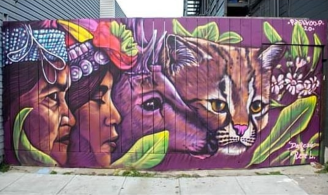 “free all Mapuche political prisoners” “Libertad a todos los presos politicos Mapuche” Painted July, 2020 in the Mission, San Francisco. honoring the Mapuche elders, healers, leaders, political prisoners and youth & in honor of the native biodiversity of southern Chile. Dedicated to René López Segovia.