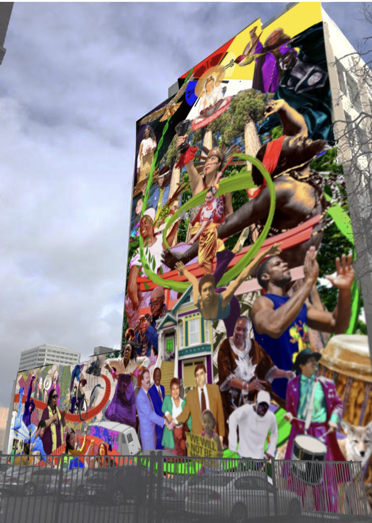 But only three months later, a condo was proposed for the parking lot in the center of the murals that would completely obliterate the art. The community that came together to create the murals morphed into the Oakland Creative Neighborhood Coalition (“Keep Oakland Creative”). They definitely made a “joyful noise” as they converged on City Hall– dancing, drumming, and bearing signs saying “Keep Oakland Culture,” and attending planning meetings to bring equity to the discussion of how Oakland should frame development projects.