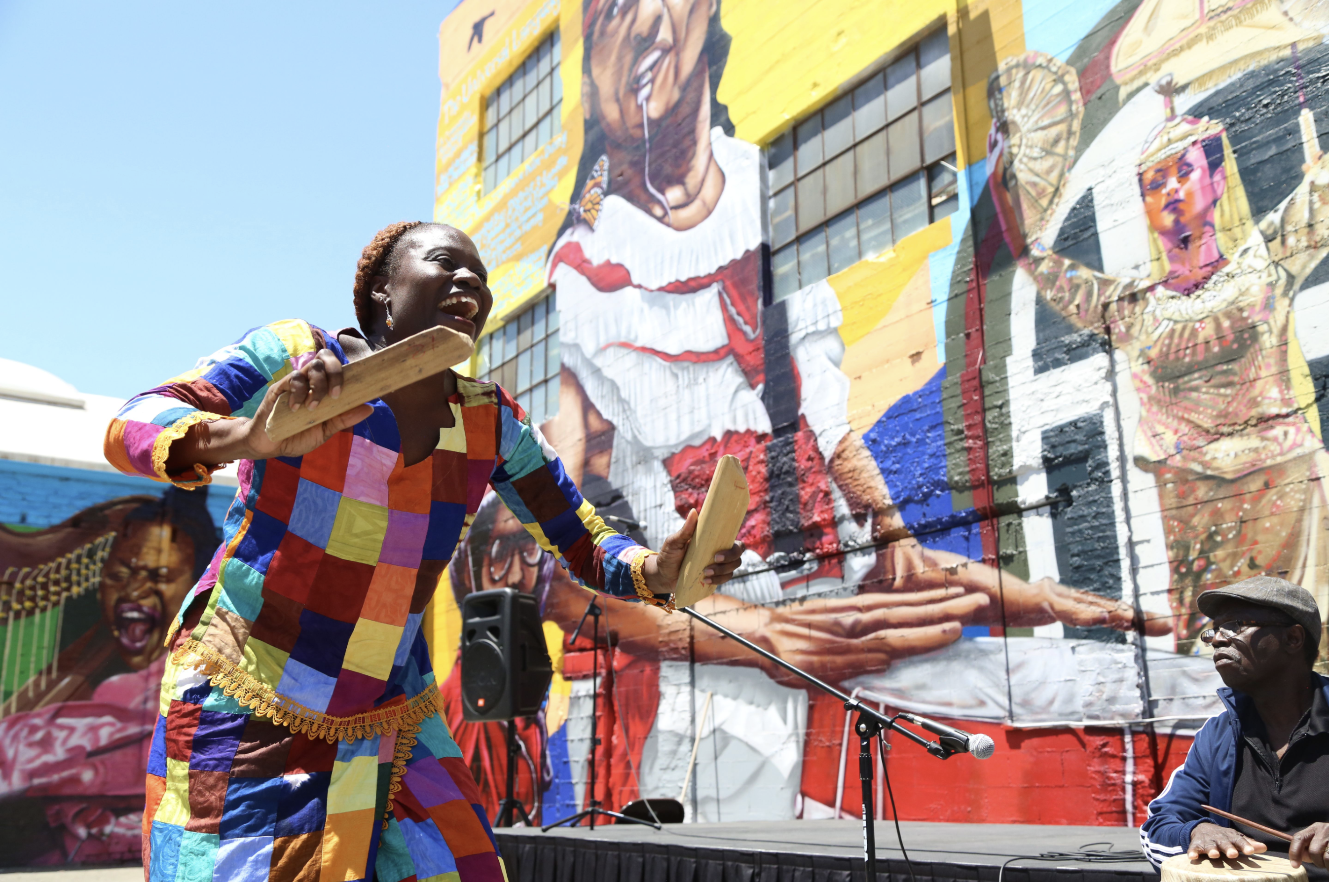 But what exactly does that look like? And to whom? Older Chinese wanted to underscore Asian successes, music, and dance, not just their struggles. The artists and residents of the Malonga Casquelourd Center for the Arts wanted to honor not only the legacy of Casquelourd, the Cameroonian dancer, choreographer, instructor, and founder of performing arts companies, but the Afro-Diasporic-inspired dancers and drummers who make the Center—and the City– come alive. And then there was “Jane Doe,” a local resident who persisted in complaining every step of the way that locals walking their dogs should be included in the mural. The artists patiently and respectfully listened to all. The conversation also included a property owner of one of the mural sites, whose proposed development would require the wall painting be ultimately re-located. Gentrification was real, and more was on the way.