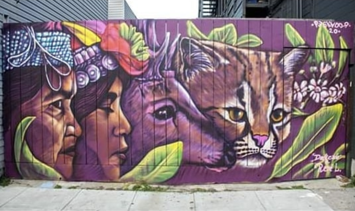 “free all Mapuche political prisoners” “Libertad a todos los presos politicos Mapuche” Painted July, 2020 in the Mission, San Francisco. honoring the Mapuche elders, healers, leaders, political prisoners and youth & in honor of the native biodiversity of southern Chile. Dedicated to René López Segovia.