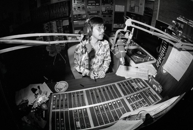 Fong-Torres at KSAN-FM, the dominant rock station in the Bay Area through the ’70s. He joined as a fill-in for a month in 1970 and wound up doing weekends for a decade–while editing and writing for Rolling Stone. Photo Credit: Fred Morales, Jr.