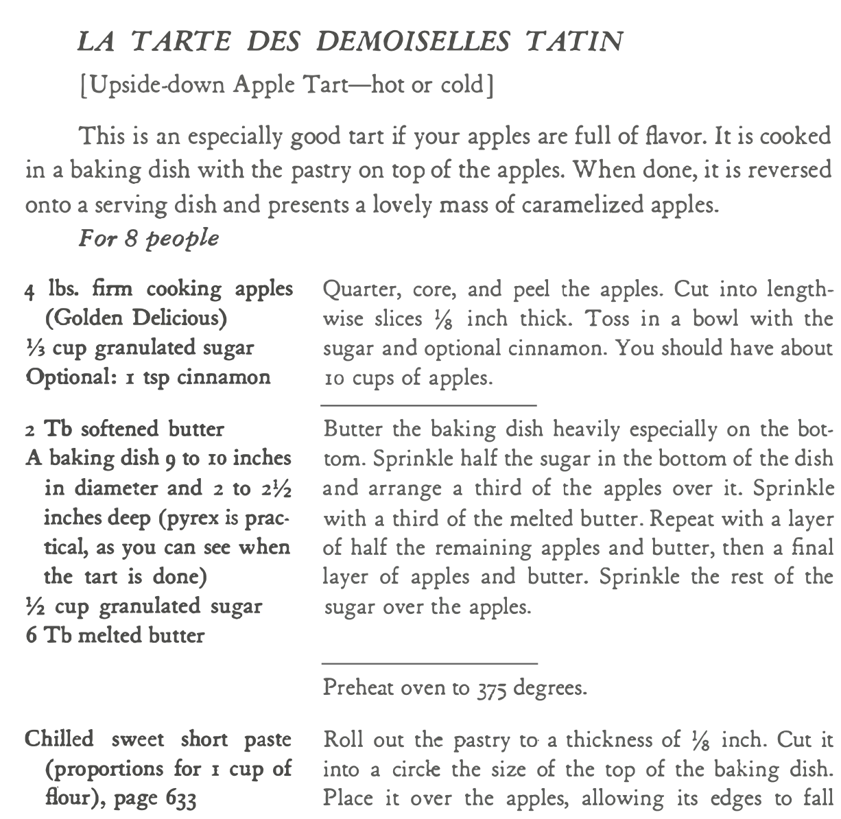 Watch The French Chef make La Tarte if you are a PBS member or watch Amy Traverso making with a split screen of Julia preparing the La Tarte.