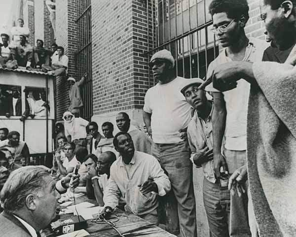 Inmate negotiating committee with Commissioner Russell G.Oswald in D-yard, Thursday, September 9, 1971. Sitting (elbow on table, wristwatch) is Richard Clark. Half-rising is Carl El Jones. Standing (behind Jones) Herbert Blyden, Frank ‘Big Black’ Smith, Roger Champen, L.D. Barkley, and an unknown inmate who has broken into the negotiation.