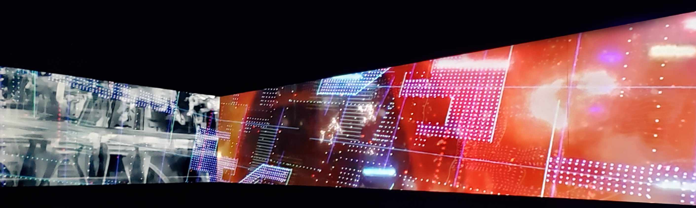 My screening was introduced by CineChamber director Naut Humon. The viewers are all simultaneously ushered into a room with chairs around the perimeter, though they are encouraged to sit on the floor for maximum effect. It’s presented on 10 screens, which since it’s a 360° presentation you might assume would be arranged in a circle but instead it is a rectangle so you get three flat screens on two walls and two screens on the adjacent walls. The imagery does truly surround you, in most cases, seamlessly. And there was no cheating, no mirroring of one wall onto another or repeating images except when it was thematically necessary.