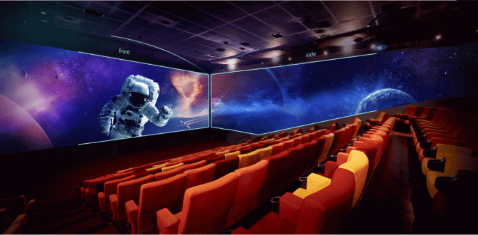 There are various other attempts to draw the audience in and they can be confusing. MX4D is a similar system that comes from America, it has moving seats and environmental effects. And there is 4D. You can get just the motion-enabled seats synchronized to the movie in a process called D-Box which is a haptic motion technology system also used for gaming, theme parks, simulation, and training. Cinemark XD contains the same letters but don’t be misled, it’s just a large screen, in the promotion it says “and digital projection”, but nowadays that’s like saying the film has sound. And there is still the big screen standby Imax, which can incorporate 3D and features high quality sound. There is also Screen X, a process that uses multiple projectors to preset films at 270°. Apparently, the images on the sides are projected on walls, that additional imagery is either shot during principal photography, as Cinerama did; or added in post using CG set extensions, which must be a costly addition.