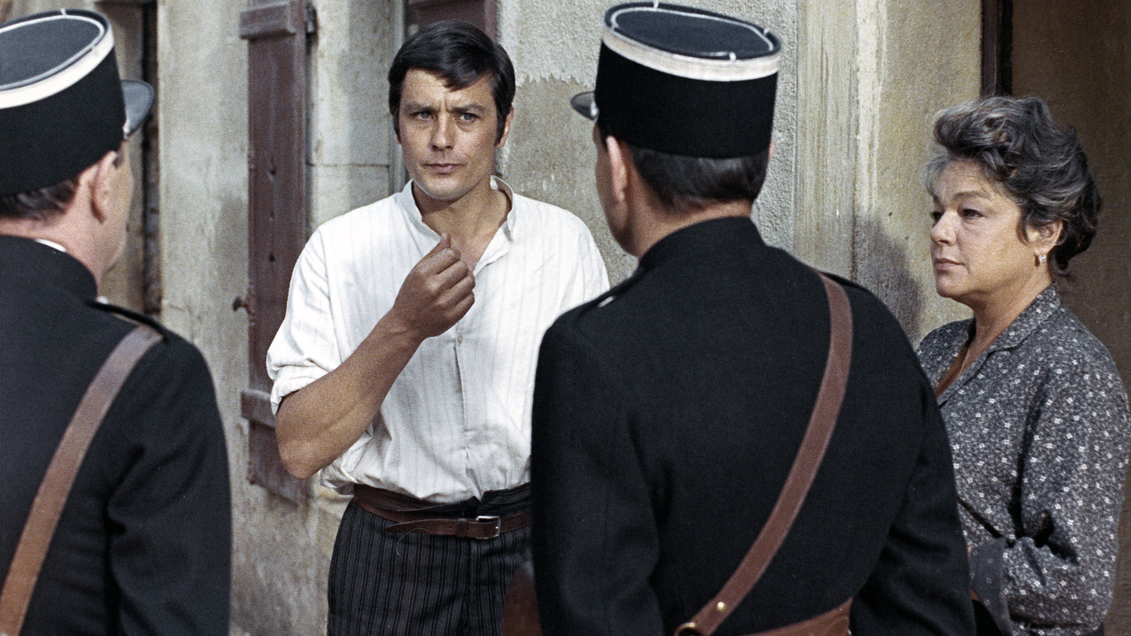 At 5 pm, there’s a triple bill (Malcolm is nothing if not generous), with three films by Pierre Granier-Deferre. Headlining the cast of Cloportes, aka The Metamorphosis of Woodlice (1965) are Lino Ventura, Charles Aznavour, Pierre Brasseur, Irina Demick, and Françoise Rosay, in a tale of revenge among thieves. La Veuve Couderc (The Widow Couderc, 1971), based on a Simenon novel, stars Simone Signoret as the widow who takes in an escaped convict, played by Alain Delon.