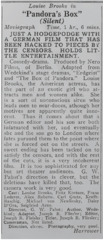 A 1929 review of a much-cut Pandora’s Box. The restored version that will be screened at the Paramount has a running time of 134 minutes.