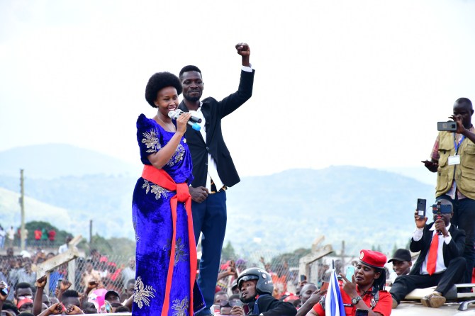 Bobi Wine on top of his vehicle with his wife Barbara ltungo Kyagulanyi as they campaigned in Kasanda district, Central Uganda on November 27, 2020.(photo credit: Lookman Kampala)