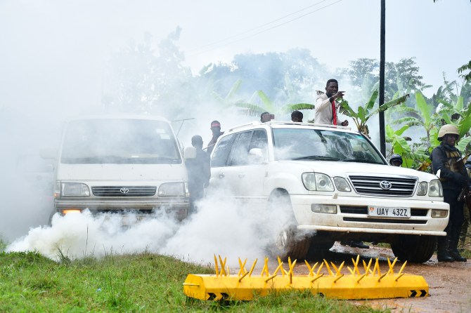 Bobi Wine, braves the tear gas with his campaign team in order to reach the campaign destination in Sironko District, Eastern Uganda, December 15, 2020. (photo credit: Lookman Kampala)