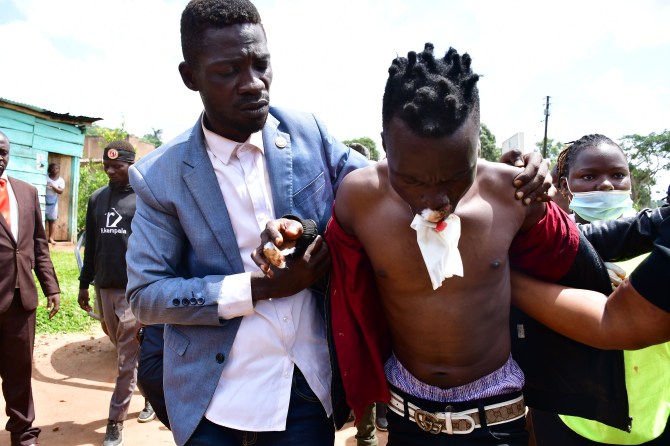 Bobi Wine assists his music producer Dan Magic into a hospital in Kayunga, Uganda, after he was injured by police teargas canisters and rubber bullets used to disperse crowds on December 1, 2020.(photo credit: Lookman Kampala)