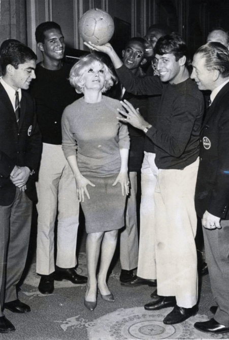 Exotic dancer Carol Doda held up by Peter Tork of The Monkees, and surrounded by the rest of the band (Davy Jones, far left, Michael Nesmith, left back, and Micky Dolenz, right) in 1968
