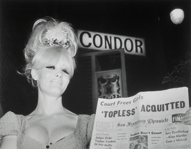 Things began to bust out all over North Beach after a victory of the bare bosom in battle with city officials. Carol Doda, she of the “Topless-Jerk” shows off the headlines in front of the Condor where she performs. She then climbed out of this chaste costume and out of her performing clothes and again things on North Beach were back to normal. (Photo Credit: Getty)