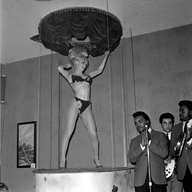 Carol Doda dances The Swim dance (song written by Sly Stone) atop the piano at The Condor Club. (Photo Credit: The San Francisco Examiner)