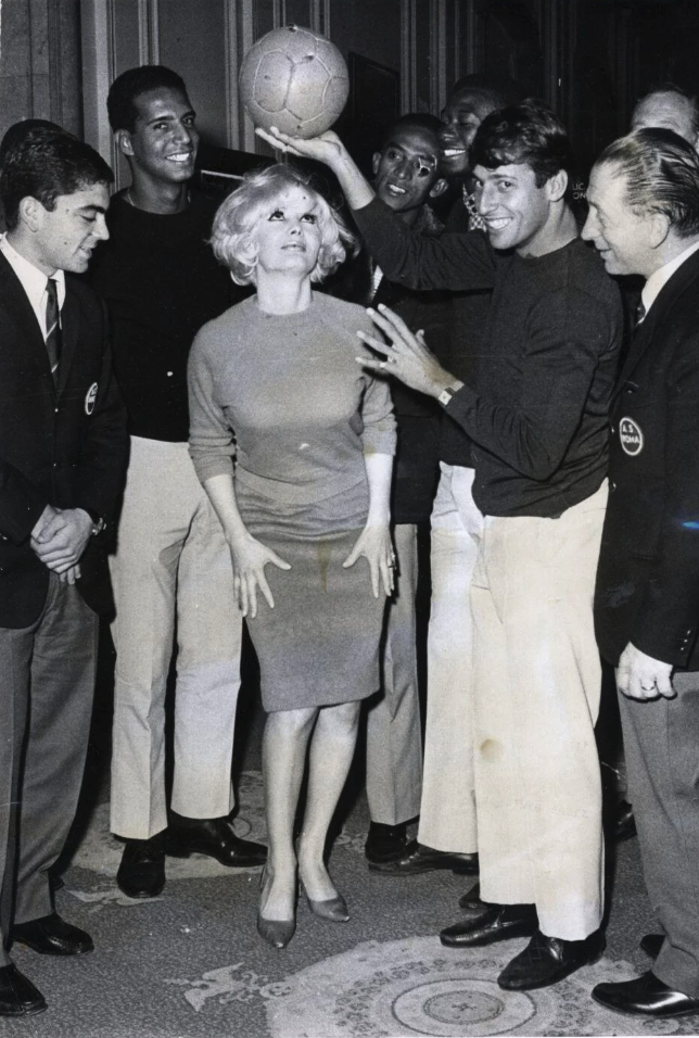 Exotic dancer Carol Doda held up by Peter Tork of The Monkees, and surrounded by the rest of the band (Davy Jones, far left, Michael Nesmith, left back, and Micky Dolenz, right) in 1968
