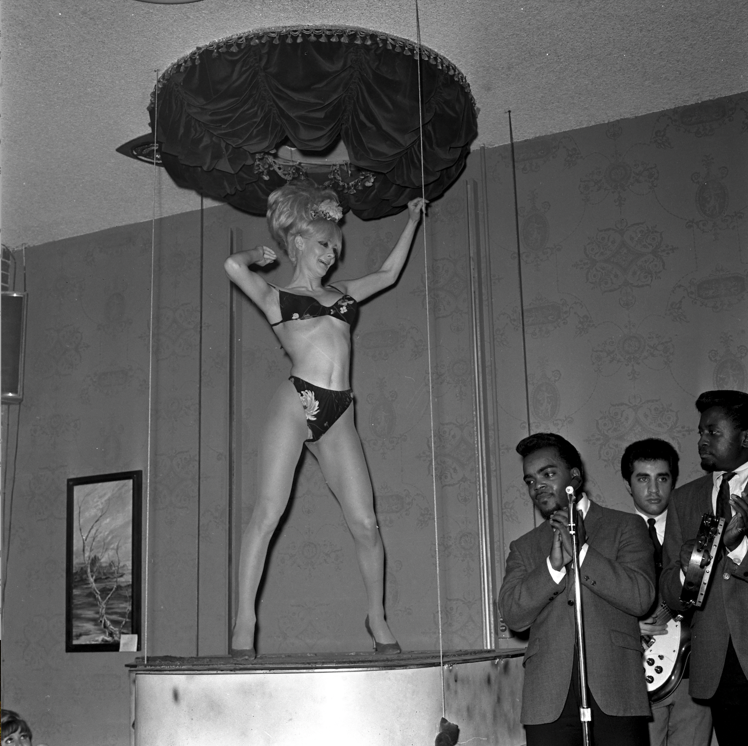 Carol Doda dances The Swim dance (song written by Sly Stone) atop the piano at The Condor Club. (Photo Credit: The San Francisco Examiner)