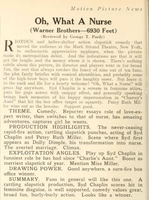 I’m especially looking forward OH! WHAT A NURSE! at 4:15pm. A rarely seen slapstick comedy starring Syd Chaplin in his second role as a female impersonator following CHARLEY’S AUNT (1925). Adapted from a story by playwright and screenwriter Robert E. Sherwood by Darryl Francis Zanuck (who would later become a three-time Oscar-winning producer and head of 20th Century Fox Studios), it had a working title of NIGHTY-NIGHT NURSE. Chaplin plays cub reporter Jerry Clark who impersonates his newspapers’ advice-to-the-lovelorn columnist where his suggestion to a reader not to marry a man she doesn’t love (Jerry has a crush on her) leads to a series of crazy adventures and a plenty of laughs. Chaplin finds himself also dressed up as a nurse plus the female head of a rum bootlegging gang.