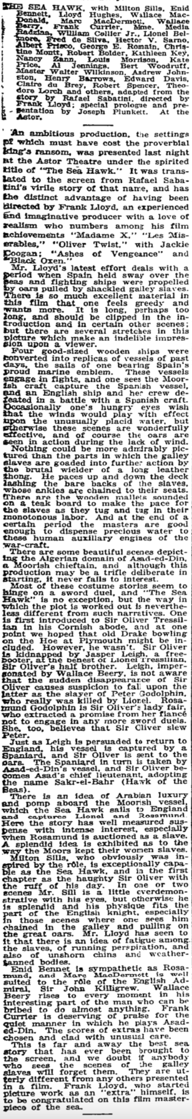 Camera Magazine (Nov. 10, 1923) wrote: “An interesting flotilla set sail from here a few days ago with the departure of the seven ships bought here [in San Francisco] at a cost of $45,000.00 for the Frank Lloyd Productions next picture, Black Hawk. Perhaps no stranger outfit ever set sail on the Pacific, for there were seven ships of all sorts and kinds towed by a torpedo destroyer. Besides their own equipment, the boat carried full crews and cargoes of ropes, lifeboats, sails, winches, and all sorts of sea-going supplies. The destroyer also carried a cook, and a fully equipped galley where all the food was cooked and hauled out via cables to the other ships like a large sea-going cafeteria. Most of the picture will be filmed somewhere in southern waters, with some location work near Burlingame [near San Francisco].”