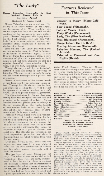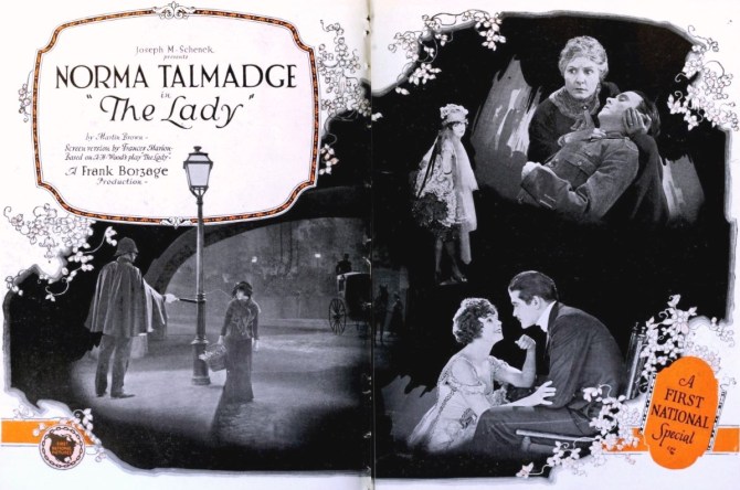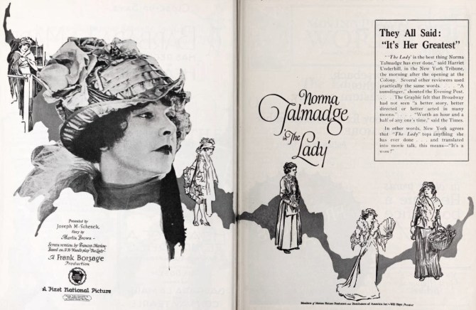 Norma Talmadge stars in a very “pre-code” THE LADY at 6pm. Her masterful performance is often called one of Norma’s best. A sumptuous production directed by the master of melodrama, Frank Borzage, and written by Frances Marion, it is very much a “pre-code” movie. The Pordenone Silent Film Festival wrote: “THE LADY, like many of Talmadge’s films, was based on a successful Broadway stage play. It represents an exception in her career, however, because it did not meet with the usual popular success. In this instance, some critics were even fierce, and her fans were bewildered to see their favorite in the role of an old woman, telling the tragic story of her past to a sympathetic customer at her bar. We learn she is a former music hall singer, seduced and abandoned, forced to turn her baby over to the care of others, and she spends the rest of her life searching for her son. It was a plot that was too melodramatic and even a bit rough for respectable audiences, especially those in the heartland of America, because it was not difficult to guess her real occupation.”