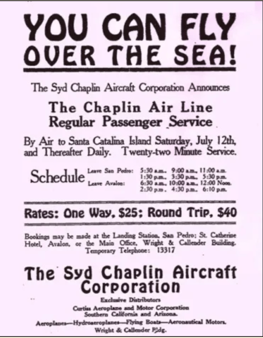 Exploring new ideas, he partnered with pilot Emory Herman Rogers Jr. to develop the first privately owned American airline. They had the first roundtrip Los Angeles to San Francisco flight in one 24-hour period. Charlie and many other celebrities including Amelia Earhart took their first ever airplane flights with the Syd Chaplin Airline Company.