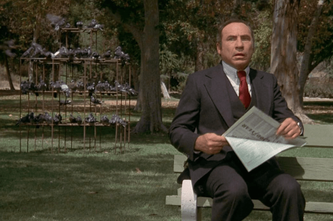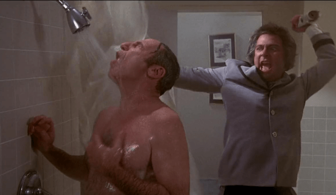 Hitchcock wholeheartedly approved of the idea he would be spoofed, and suggested that Brooks would do best by ridiculing the most obsessive films in the director’s vast oeuvre. “He told me, ‘Play the tower scene from Vertigo [1958].” And with Psycho [1960]: “Do it seriously, but move a half inch to the left or right. It could be hysterical.” In High Anxiety, the Vertigo and The Birds (1963) jokes are cleverly executed and funny. Brooks’ recreation of the shower scene from Psycho is the transcendent comedy moment of the movie, with Mel’s own naked body replacing that of Janet Leigh.