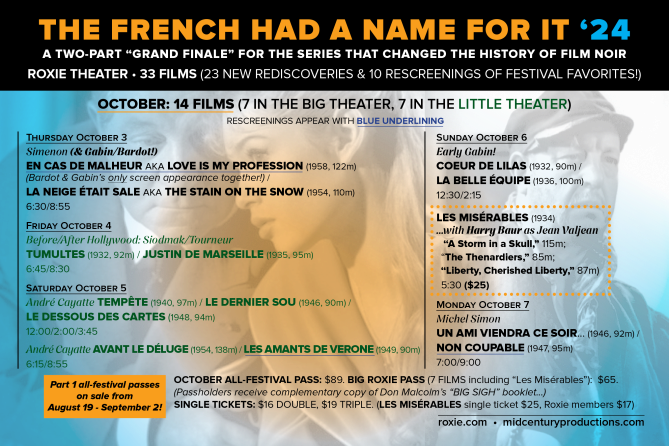 And the piece de resistance of this key formative period, the monumental-in-its-own-right 1934 version of LES MISÉRABLES, a galvanizing “missing link” between silent film aesthetics and the sound-inflected tonalities of film noir, will anchor the October schedule of FRENCH 24, a rich opening tapestry of 14 films that fill in more fascinating topographical details that Don has brought back from his journeys on “the lost continent” of French film noir.