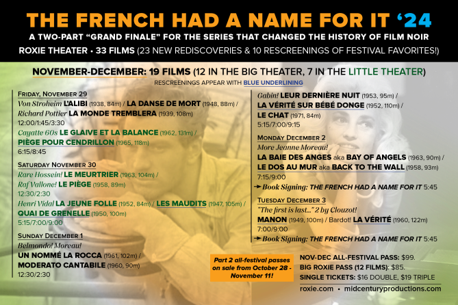 “I’ve been saying that for years, but it took awhile to find a way to screen all the films that proved my point,” Malcolm admits as he eyes his formidable FRENCH ’24 festival poster, which displays all 155 French noirs that he’s screened at San Francisco’s venerable Roxie Theater.