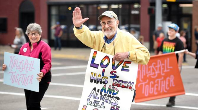 Rabbi Secher and his wife Ina Albert, two of the founding members of Love Lives Here in the Flathead Valley, take part in the Kalispell Together entry at the annual Northwest Montana Fair Parade on Friday, August 17, in downtown Kalispell. Secher’s sign reads: “Love is, has been, and always will be love.”
