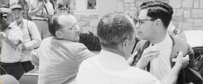 Rabbis holding a prayer service with civil rights demonstrators in the parking lot of the Monson Motor Lodge in St. Augustine, Florida, in 1964, are attacked by motel manager James Brock.