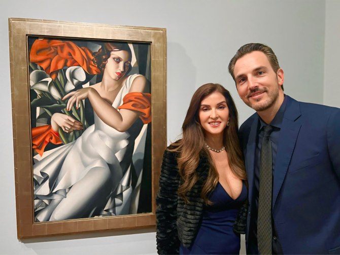 Julie Rubio and coproducer/husband Blake Wellan at the de Young’s “Tamara de Lempicka” lender reception, Thursday. At left, Lempicka’s masterpiece, “Portrait of Ira P.” (1930), which includes the hallmarks of her signature style—Ira is in a white satin gown painted so exquisitely it becomes her skin, revealing her as though she were nude. Her billowing red shawl, a marvel of air-born folds, adds a pop of color that balances the composition. She is turned toward the viewer but her gaze and mind are elsewhere.
