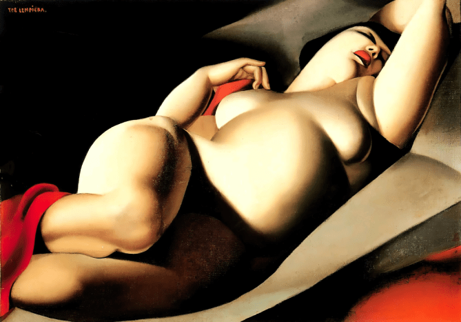 After fleeing the Russian revolution in 1917, Tamara de Łempicka landed in Paris, where she cultivated an elite social circle and became the talk of the town for her coveted modern portraits and her glamorous and flamboyant lifestyle. She soon became synonymous with Art Deco painting, which had its zenith in the interwar period. Her large body of work included commissioned portraits; paintings of her family, lovers and friends; and masterful drawings. Based on a foundation of superb draftsmanship and a mastery of dramatic lighting, her chic signature style was characterized by vibrant metallic hues, bold geometrics and an icy vibe. She understood sensuality and painted women in elegant couture gowns that fit like a second skin. Her female nudes were unique; they were provocative but absorbed in their own thoughts and pleasure and thus had agency. While Lempicka emerged as one of the most skilled painters of her generation, her work was sidelined by many critics as decorative, and its eroticism was misinterpreted as being pandering to women.