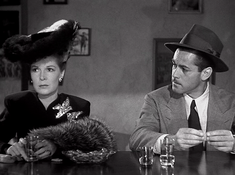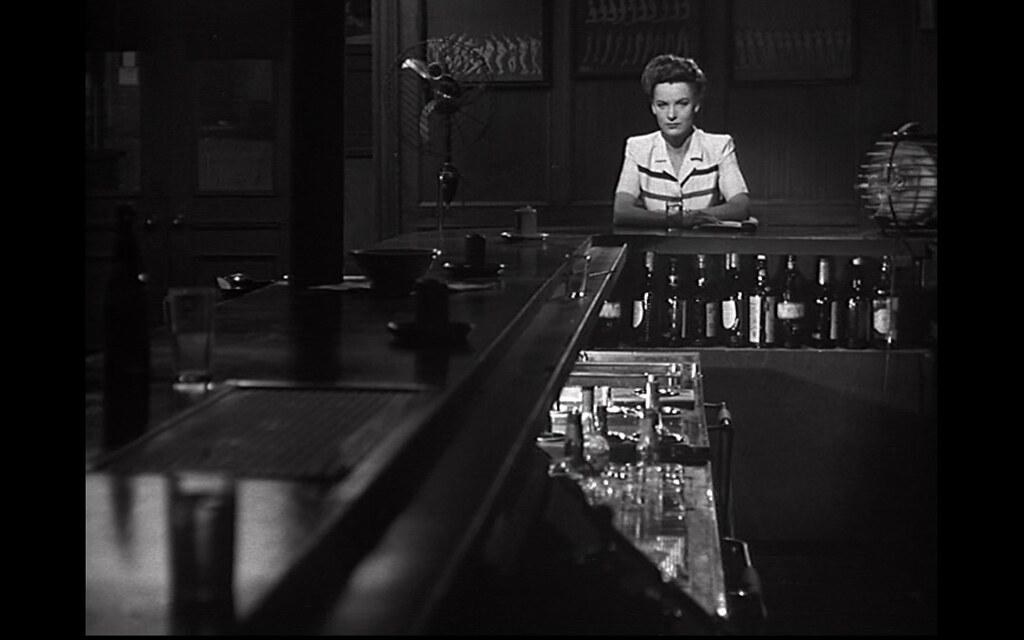 There is a scene in this 1944 noir in which spunky secretary Carol Richman (Ella Raines), nicknamed “Kansas,” starts searching for the woman who is her boss’s only alibi in the murder of his wife. Kansas visits the saloon where Scott Henderson, on the outs with his spouse, asked a “phantom lady” he’d just met to accompany him to a show. Upon entering, she asks for a drink, hoping to glean some dope about the mysterious woman in the extravagant hat—the only clue she has. Kansas will nurse that drink ’til closing time, silently eyeing the creepy barkeep (Andrew Tombes), hoping to spook him into revealing a precious detail that will put her on the phantom lady’s trail. Thus Kansas begins her descent into the noir netherworld of novelist Cornel Woolrich, brilliantly realized on-screen by producer Joan Harrison, director Robert Siodmak, and director of photography Woody Bredell.