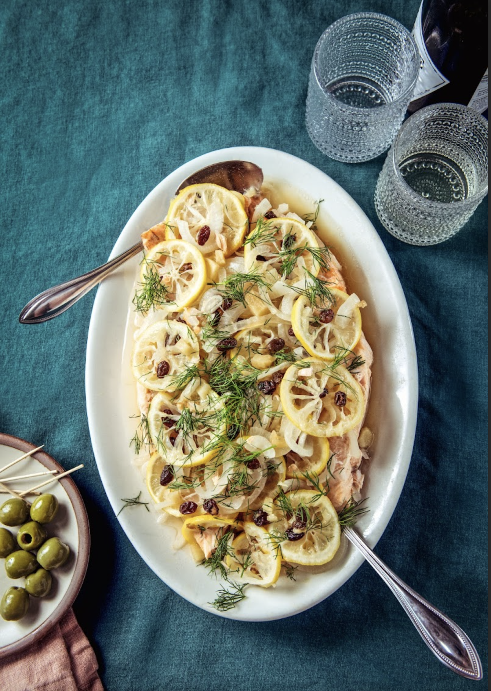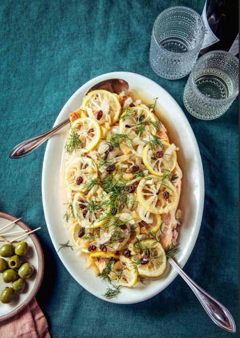 - Season the salmon with salt and pepper to taste in a large heavy-bottomed skillet or Dutch oven large enough to hold the fish in one layer. Add the stock, plus water if needed to barely cover the fish, arrange the lemon and onion slices on top, then drop in the bay leaf, raisins, and cloves. Simmer over medium heat, uncovered, for about 10 minutes, or until the fish is almost cooked through.