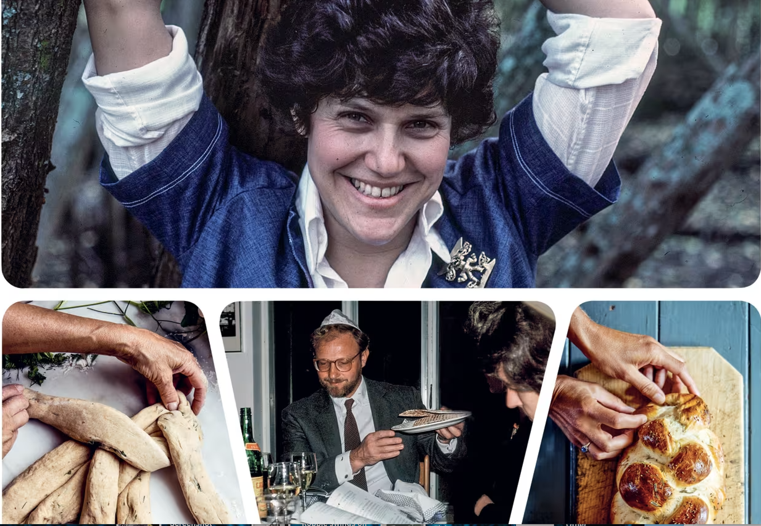 Joan Nathan; below: a family seder, a challah being made. Photos top and bottom middle courtesy of Joan Nathan; bottom left and right by Gabriela Herman.