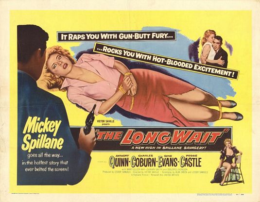 Another new-to-me title is The Long Wait (Victor Savile, 1954), starring Anthony Quinn as one of those memory-challenged guys who wakes up to find out that he has no memory, no fingerprints, and that on top of that he’s wanted for murder. (I hate when that happens.) It plays at 9 pm on Monday, January 27th. Mickey Spillane invented the story. Peggie Castle is the femme fatale, a four-times-married Miss Cheesecake in real life, who died of alcoholism at the age of 45. I’ve seen her in several movies, IMDb reveals to me, including another based on Mickey Spillane, I, the Jury, but I can’t conjure up a memory of her. However, she also appears in 99 River Street (Phil Karlson, 1953), a personal favorite, playing on the same program at 7 pm, so that ought to jog my memory.