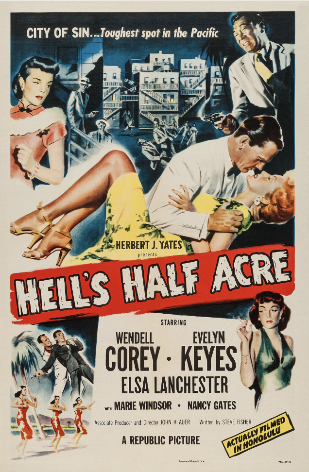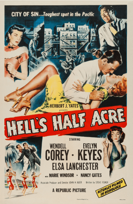 I am looking forward to seeing Hell’s Half Acre (John H. Auer, 1954), on opening night, Friday, January 24th, at 9 pm, paired with a personal favorite, The Narrow Margin (Richard Fleischer, 1952) at 7:30 pm, both starring the statuesque Marie Windsor (aided and abetted by noir stalwart Charles Shaw in The Narrow Margin, and Evelyn Keyes, Wendell Corey, and Elsa Lanchester in Hell’s Half Acre). Eddie Muller describes it as “Tiki Noir,’ and he ought to know; he has his own tiki bar in his backyard half-acre, where he also shot TCM’s “Noir Alley” intros and outros during the pandemic.