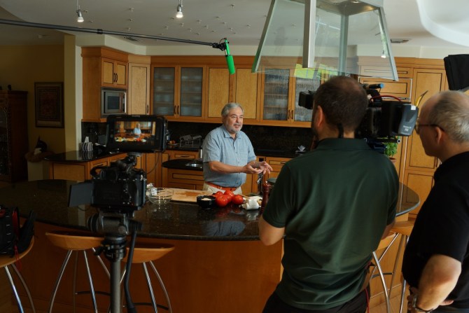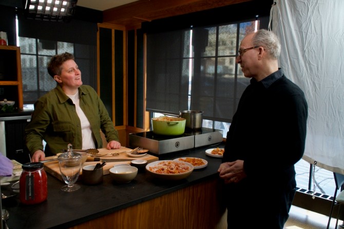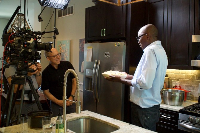Peter Miller: Shola Olunloyo never met Marcella but his life was shaped by her. He’s a brilliant, fancy Philadelphia chef who makes her Bolognese ragù every weekend. He actually refused to be filmed in his high end restaurant and asked to be filmed in his home. So we went to his home, into his kitchen, which from a filming point of view is not a demonstration kitchen, just a home kitchen. But Marcella was all about cooking at home, so the scenes we have of great chefs preparing her dishes is really about how to make her wonderful food in a home kitchen environment.