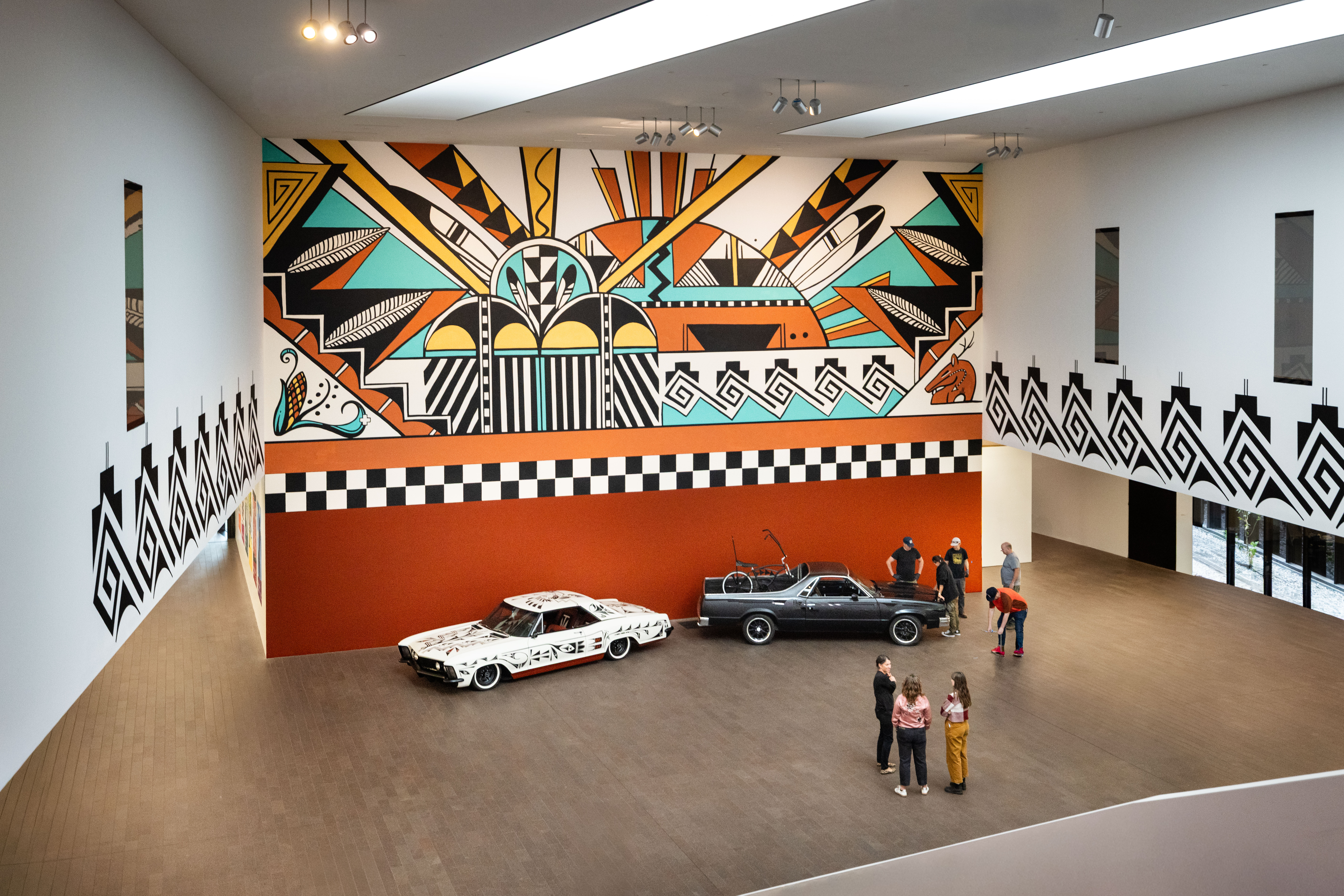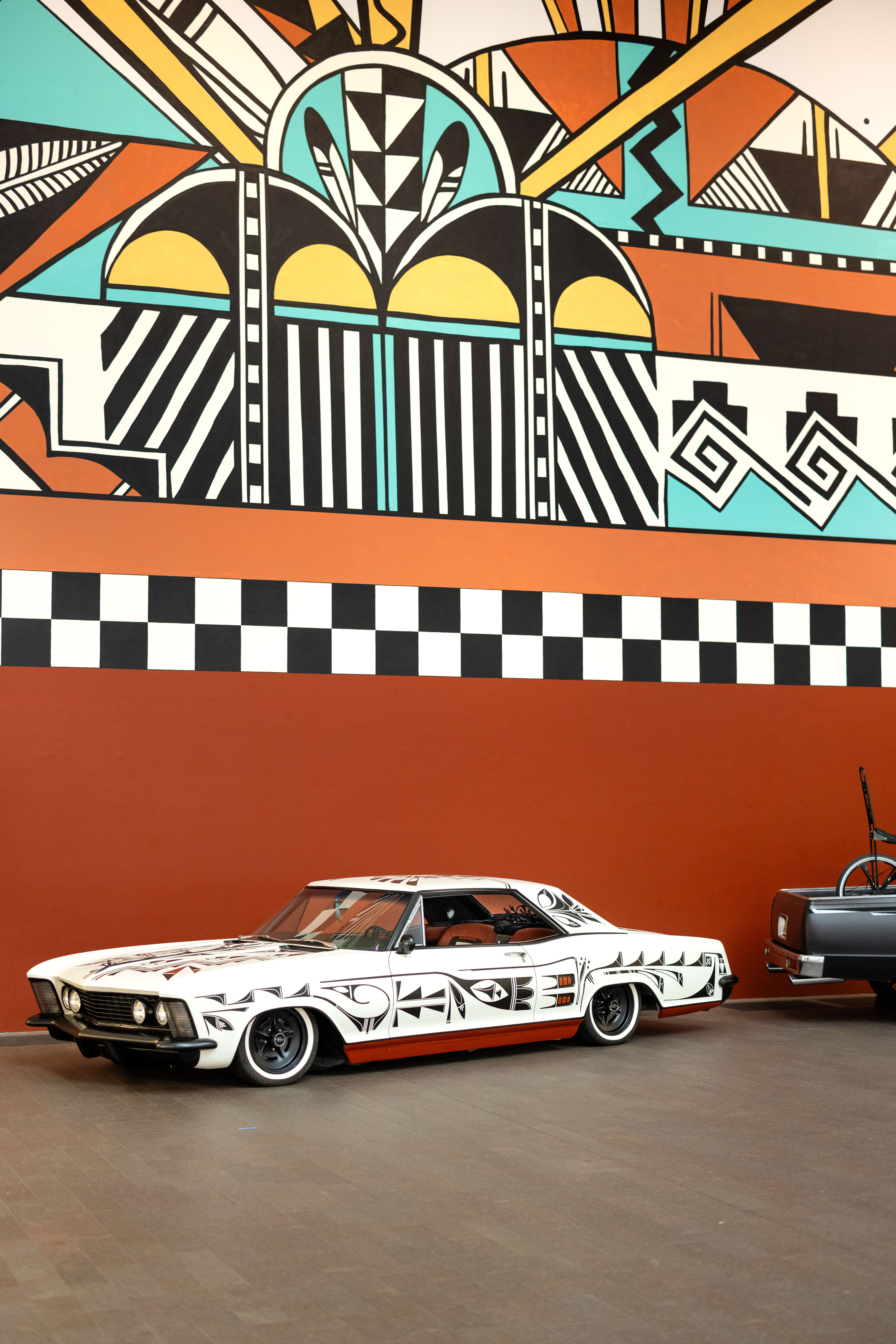 A 1964 Buick Riviera, making its debut at the de Young, has been meticulously rebuilt by Simpson and painted in vibrant Tewa polychrome. She named the piece Bosque (Spanish word for forest). Simpson made this second customized car into a lowrider, since Española is considered the lowrider capital of the world.