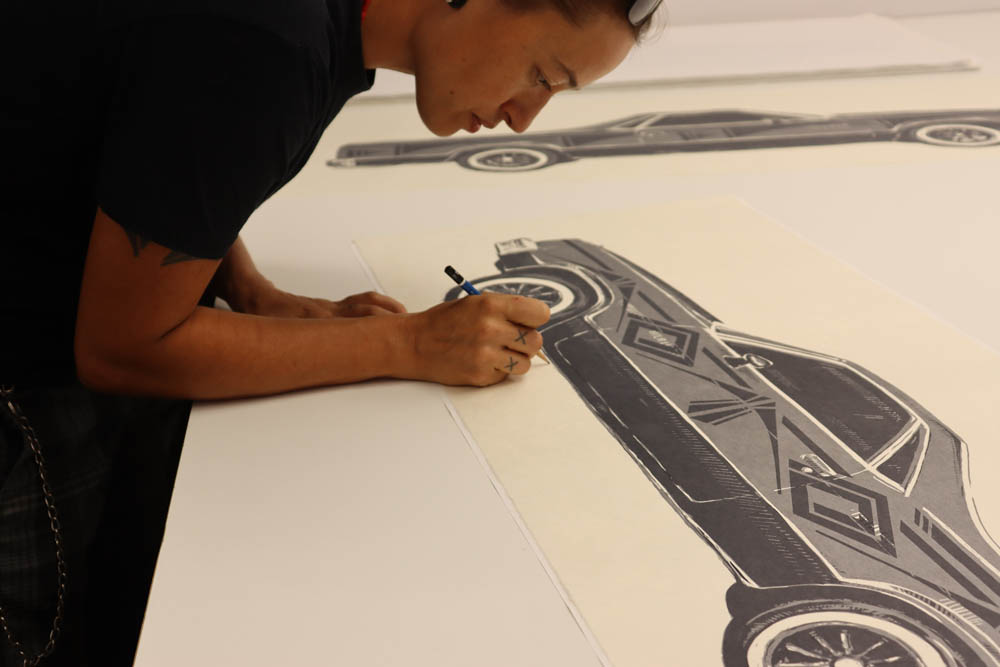 The celebrated “Maria,” which she modified and customized 10 years ago from a 1985 Chevy El Camino, painting a black-on-black geometric motif, was inspired by Tewa ceramicist Maria Martinez (1887-1980) of the San Ildefonso Pueblo in New Mexico. Martinez popularized the distinct black gloss-and-matte contrasting patterns.