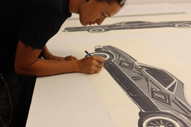 “Rose is continuing her exploration in her practice of the vessel. The two cars are vessels. But she takes it one step further,” Olcott said. “The mural is inspired by pueblo pottery designs and Southwest aesthetics. Rose is intending to transform the Wilsey Court from a sort of void into a whole.”
