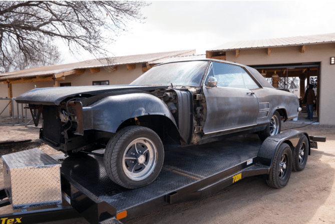 Simpson took the Buick apart before transforming it. She found a running engine in Detroit. She did the metalwork, smoothing out dents and patching the numerous areas of rust. She researched Tewa polychrome (pottery featuring multiple colors, including terracotta and cream, applied to the surface using intricate designs and patterns). She even sewed the interior leather upholstery to match the exterior.
