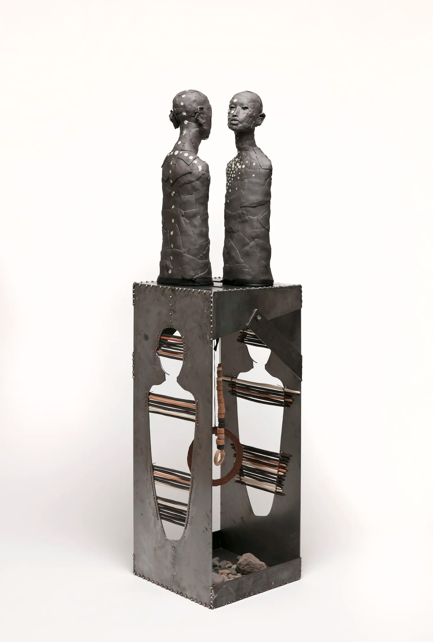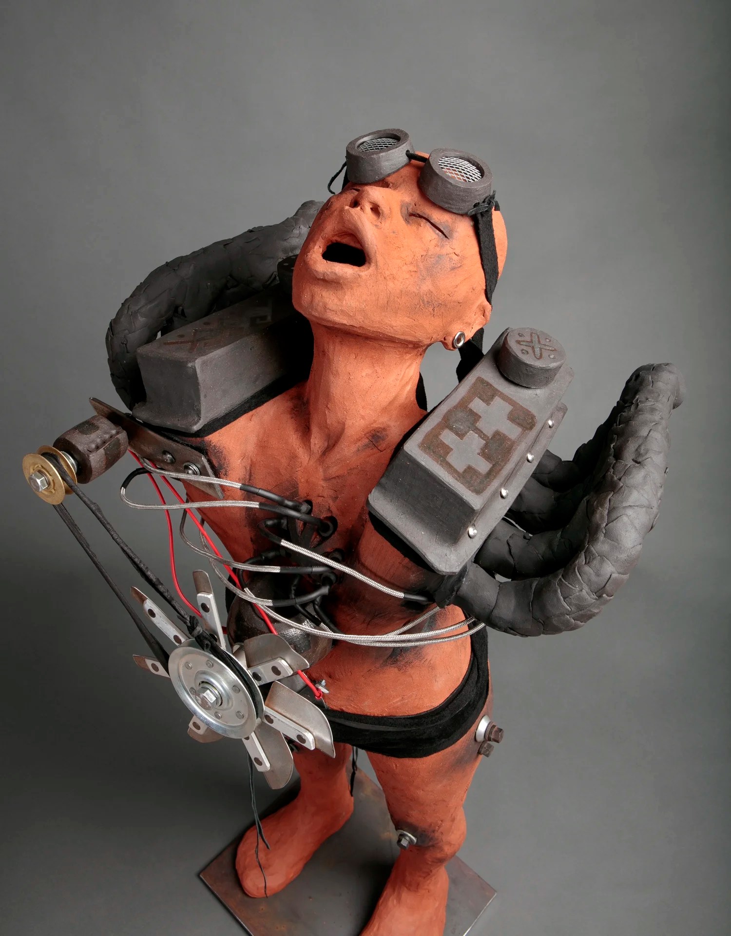 Simpson is best known for purposefully raw and imperfect clay sculptures, as well as working across multiple media, including metalwork, painting, fashion, installations and performance. Her sculptures have a post-apocalyptic “Road Warrior” vibe. They are often adorned with found objects like brake discs and other car parts. She has called some of the sculptures “beings” or “ancestors.”