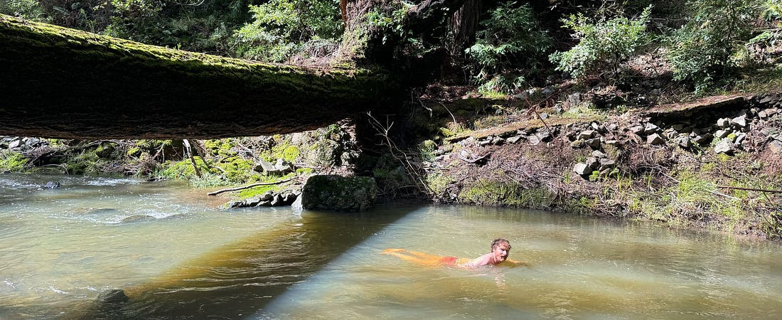 While traveling I always find the nearest blue dots on a map, bushwhack to them, and jump in. Police, rangers, property owners, or passersby yell at me for swimming. I get to feel like a rebel, shouting as I float away that water can’t be owned.
