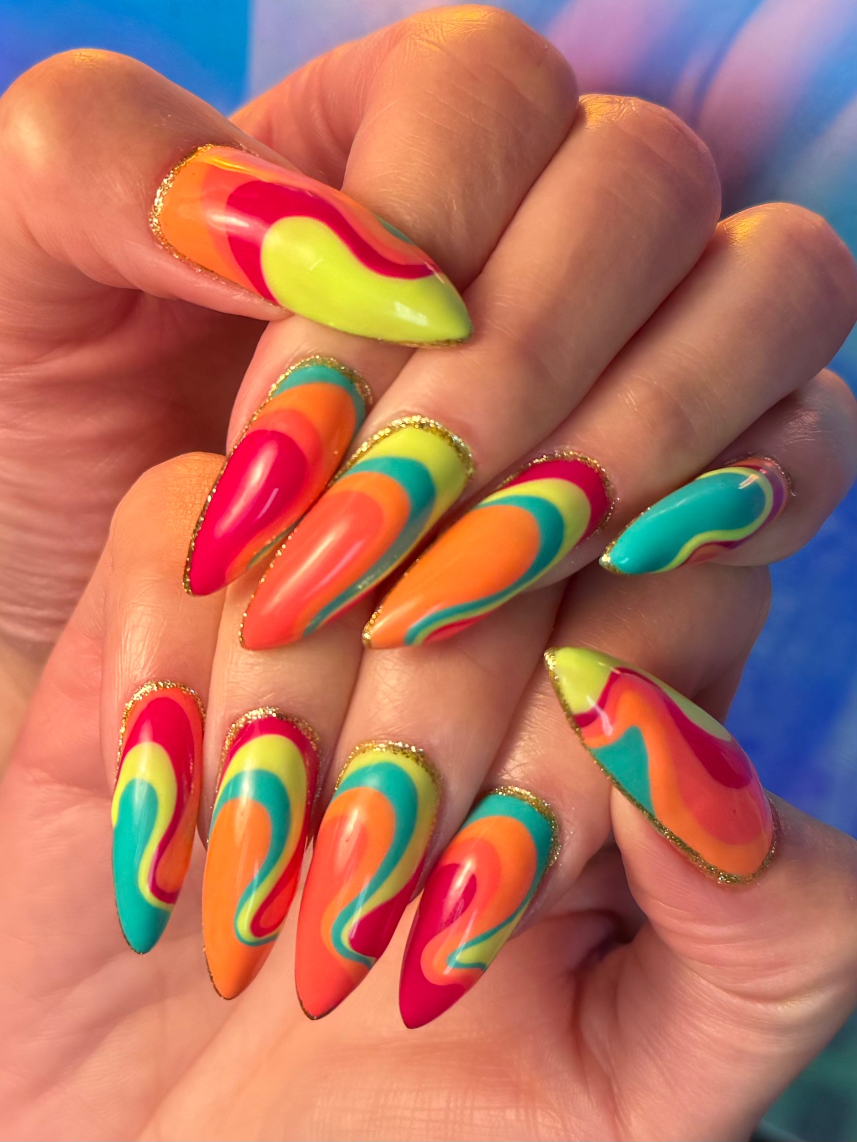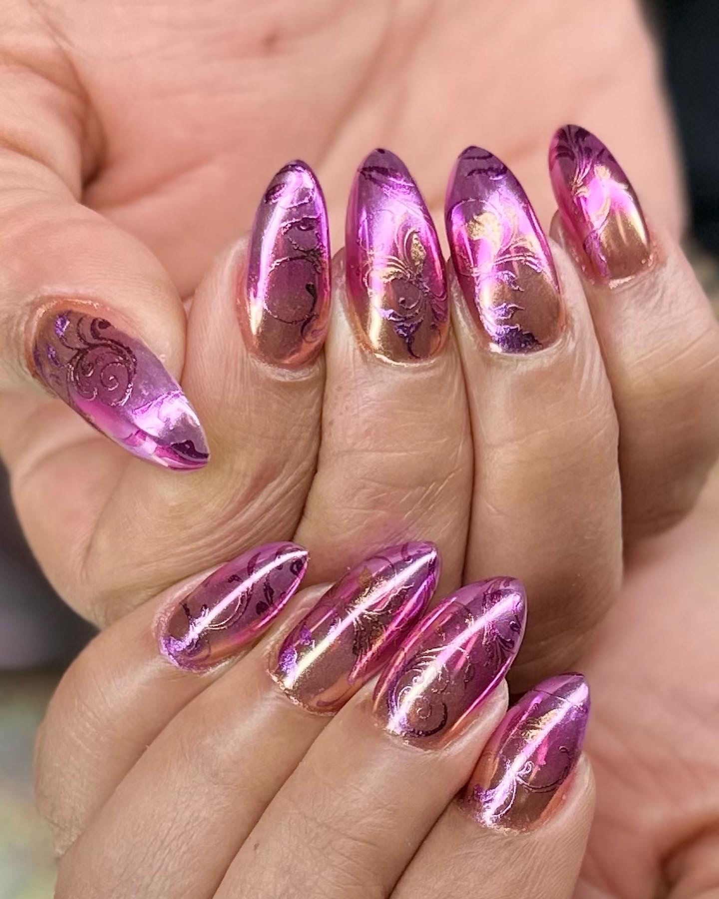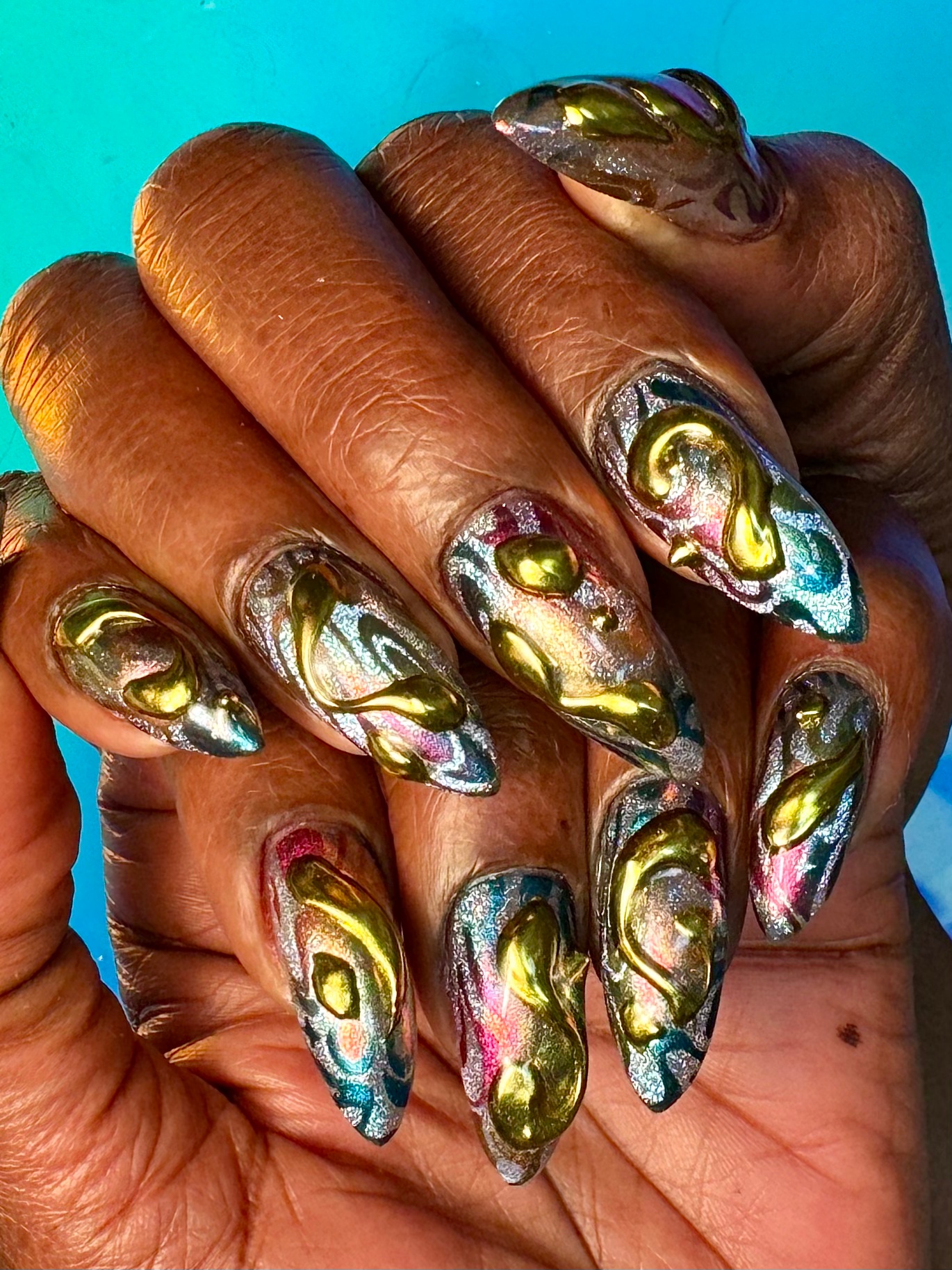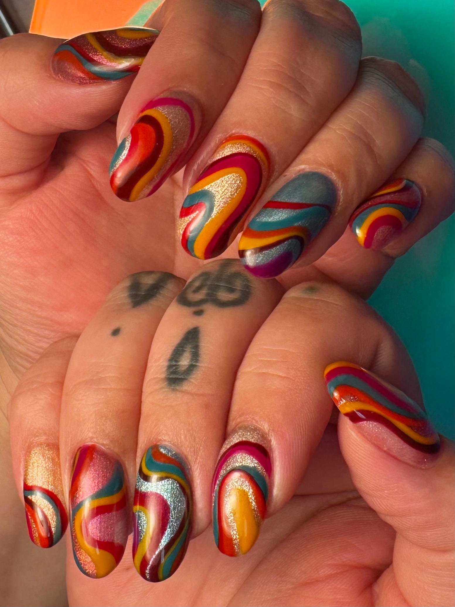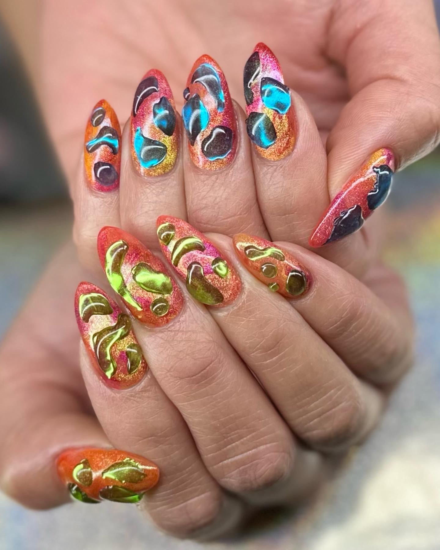 Longtime client Julia Everett walked in for an evening appointment. While some clients have specific ideas of what they want and supply Valdez-Doherty, 35, with images from social media in advance, Everett was in a more spontaneous mood. The resulting design turned out to look like a streaky, reflective oil slick one might see on a city street at night.