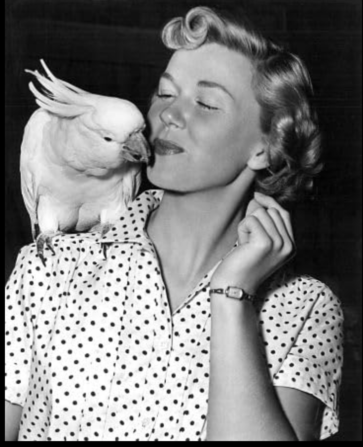 “Louise” is a cockatoo who Lauren Bacall’s character Amy calls her best friend and Doris Day is never seen interacting with the bird in the film. But it makes for a great publicity photo.